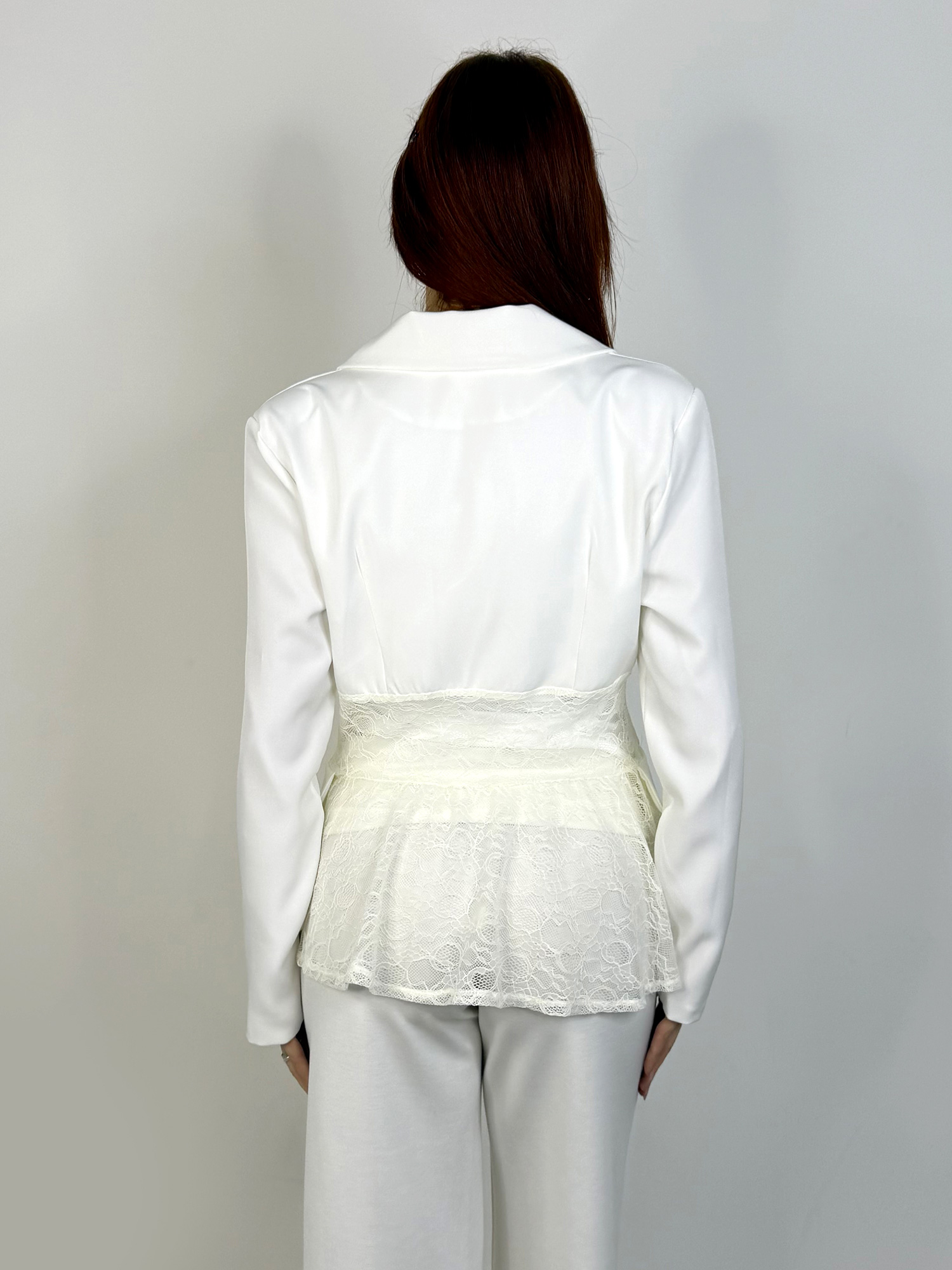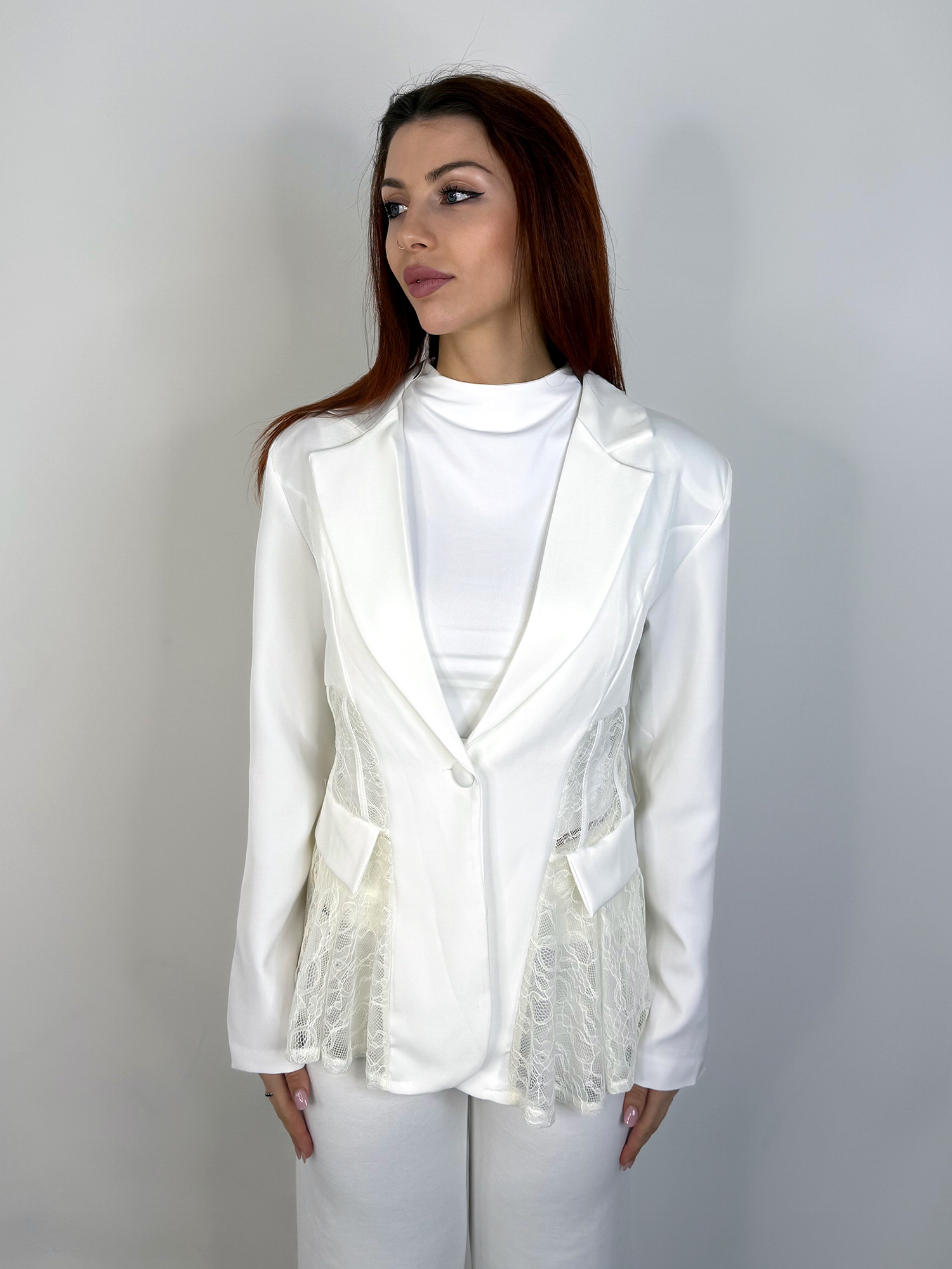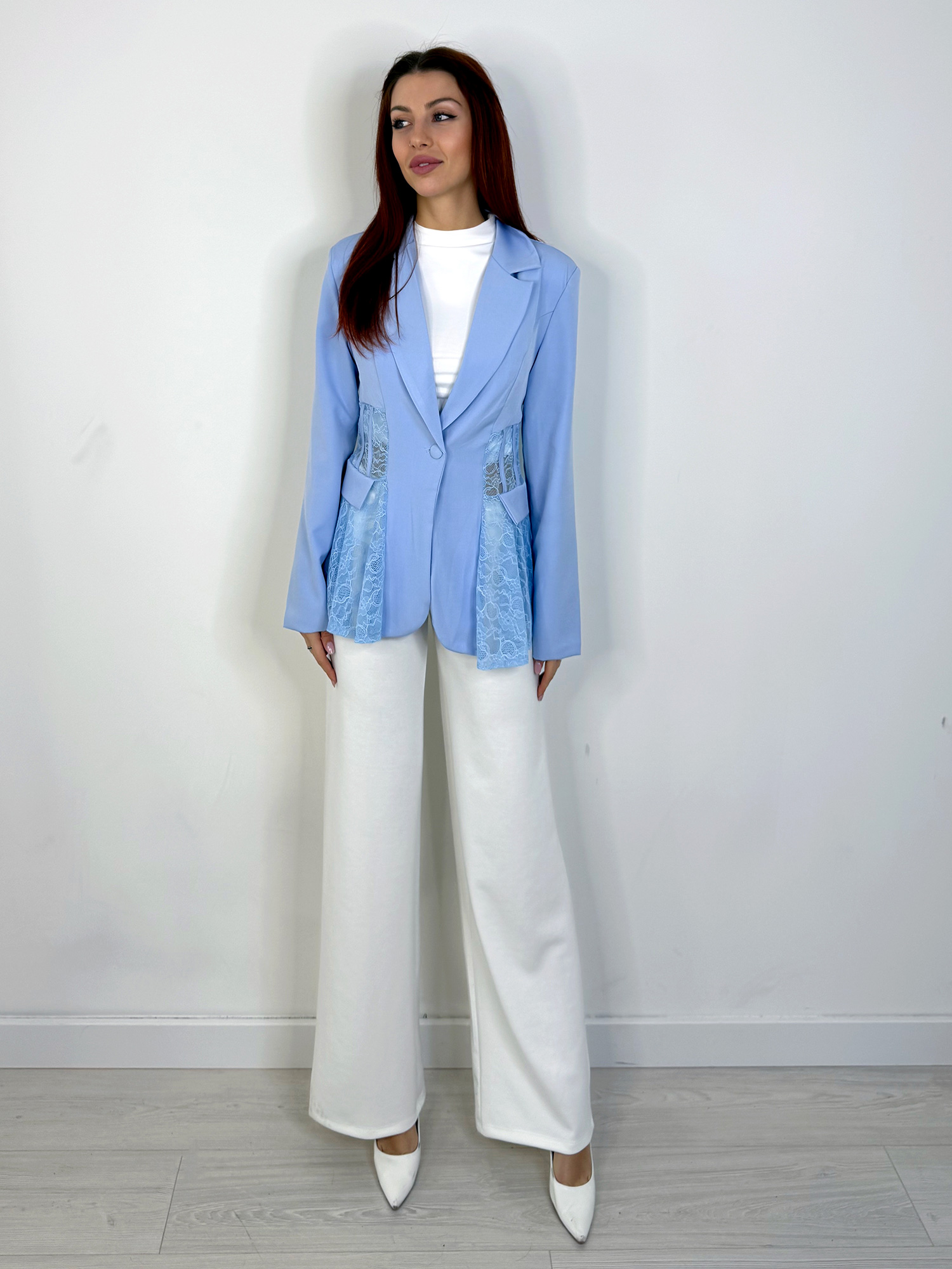 Blazer dal taglio sartoriale con dettagli in pizzo che valorizzano la silhouette con un equilibrio perfetto tra eleganza e femminilità.